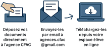 🏢 Déposez vos documents directement à l’agence CFAC 📧 Envoyez-les par email à : agences.cfac@gmail.com 🌐 Téléchargez-les depuis votre espace élève en ligne